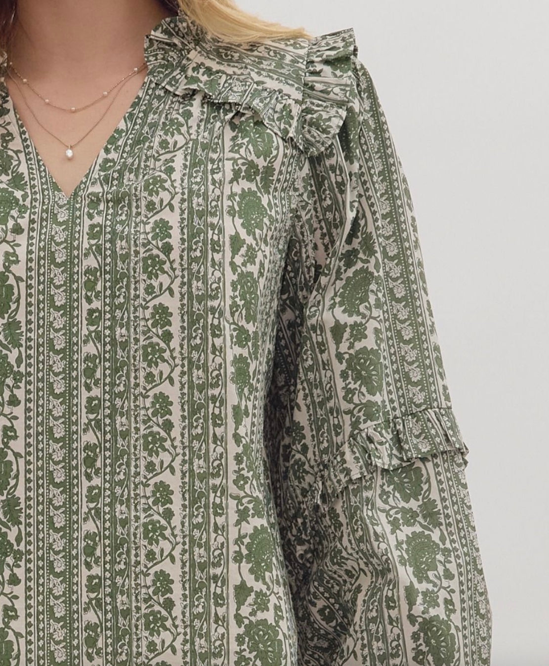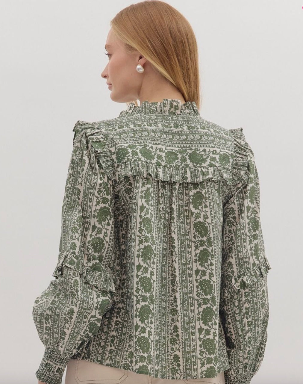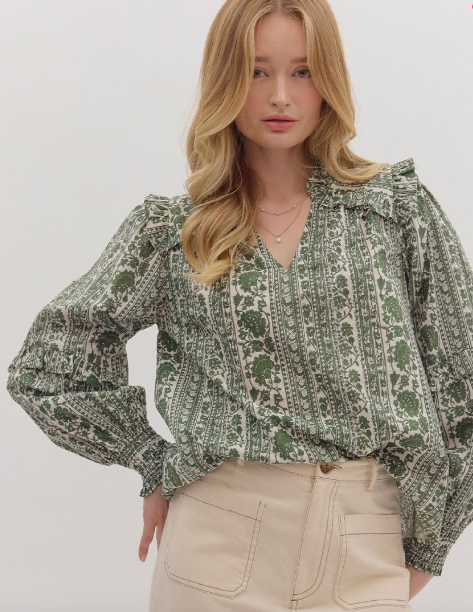 Floral stripe print long sleeve top featuring ruffled V-neck with shoulder and back yoke flounce. Smocked sleeve openings. Unlined. Woven. Non-sheer. Lightweight.