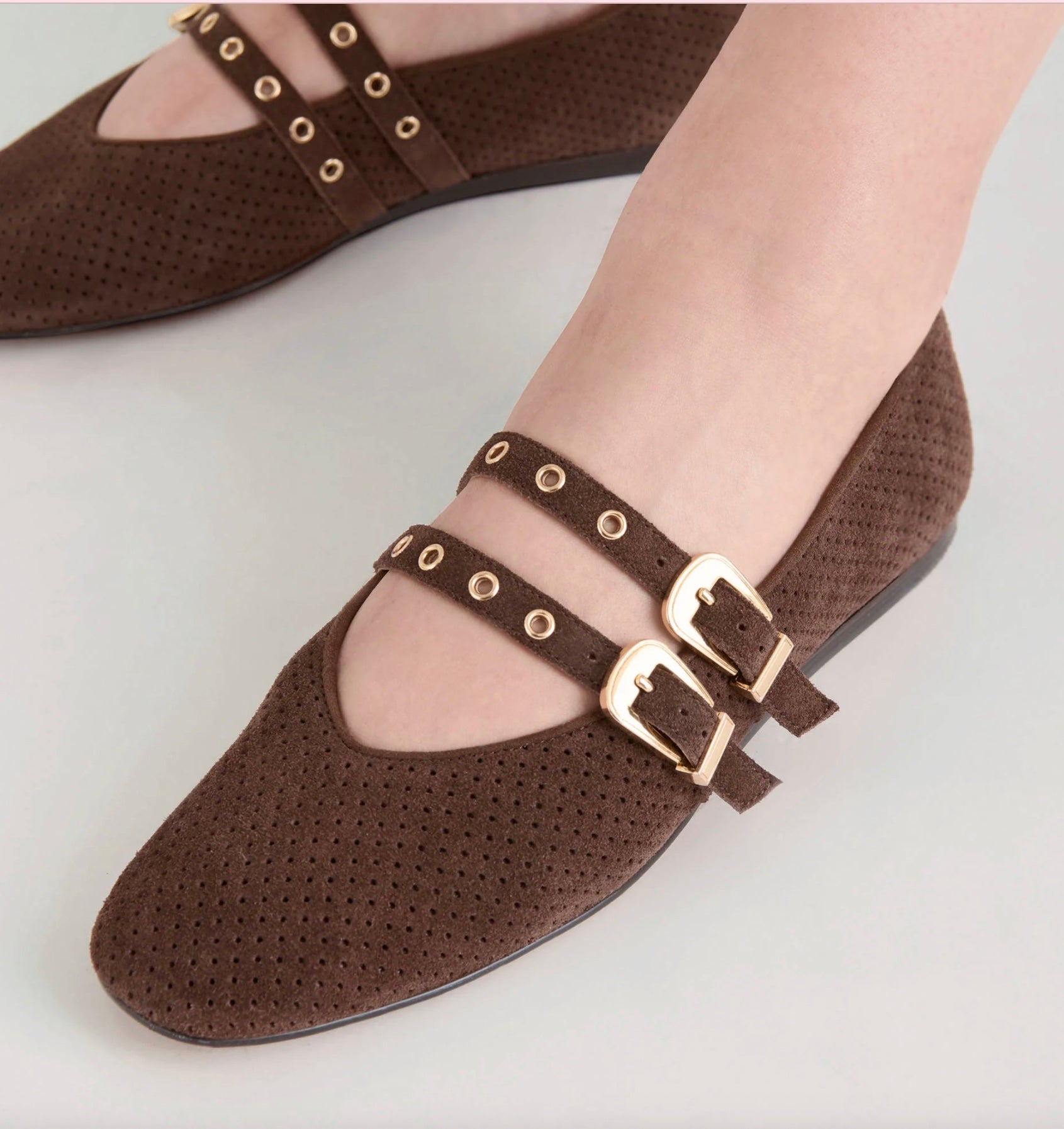 BAYLEE GROMMET makes a statement out of her double strap mary-jane design with gold metal grommets and bold buckles. This sustainably-crafted flat boasts sustainable materials and a bevy of colorways in perforated or printed suede for one on-trend and versatile ballet flat.