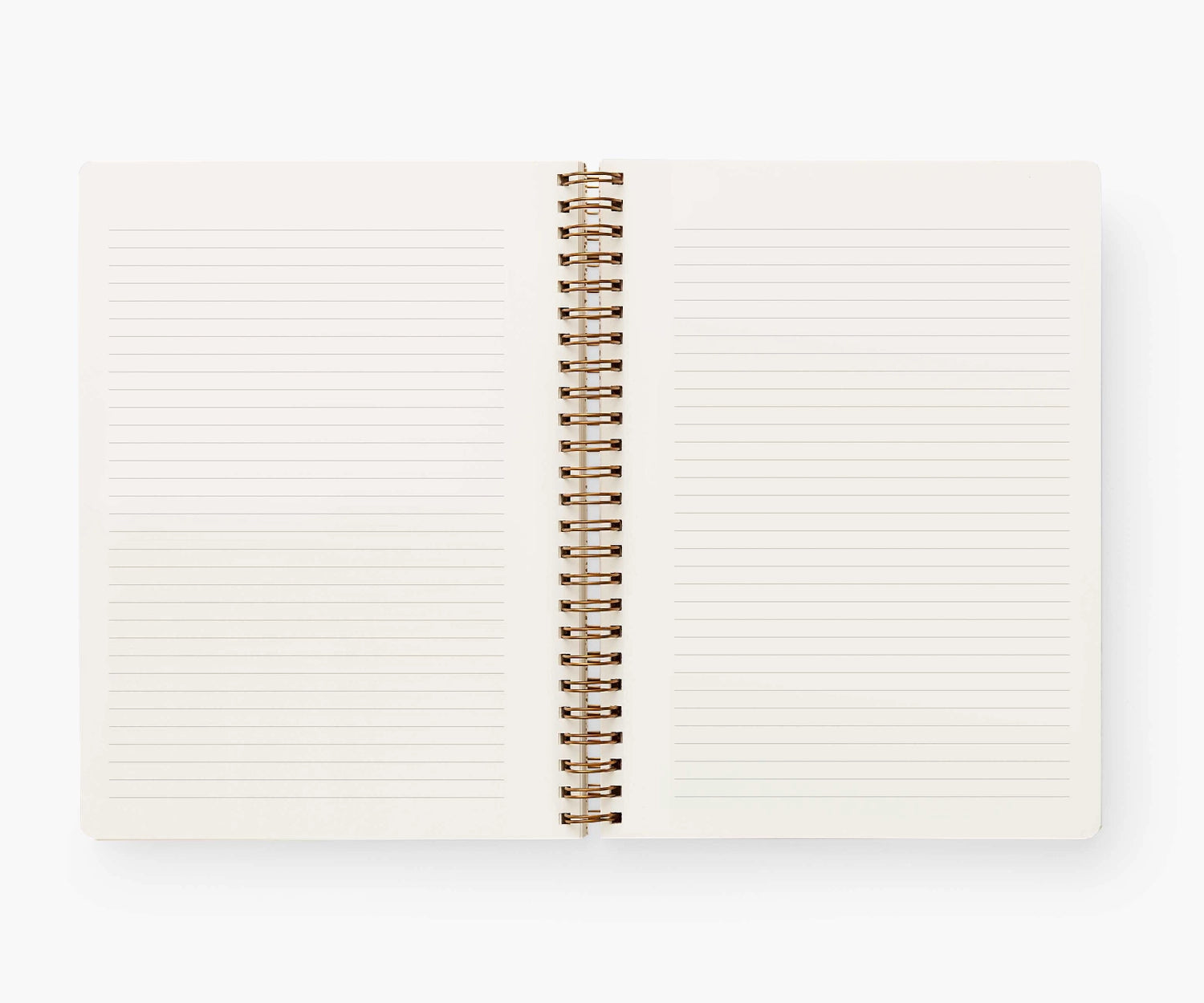 Hit the books with our new softcover spiral notebooks, featuring full-color covers with gold foil accents, printed on a heavy-weight textured paper. The notebook has 150 ruled pages, a sturdy double-spiral binding, and pockets for extra storage.