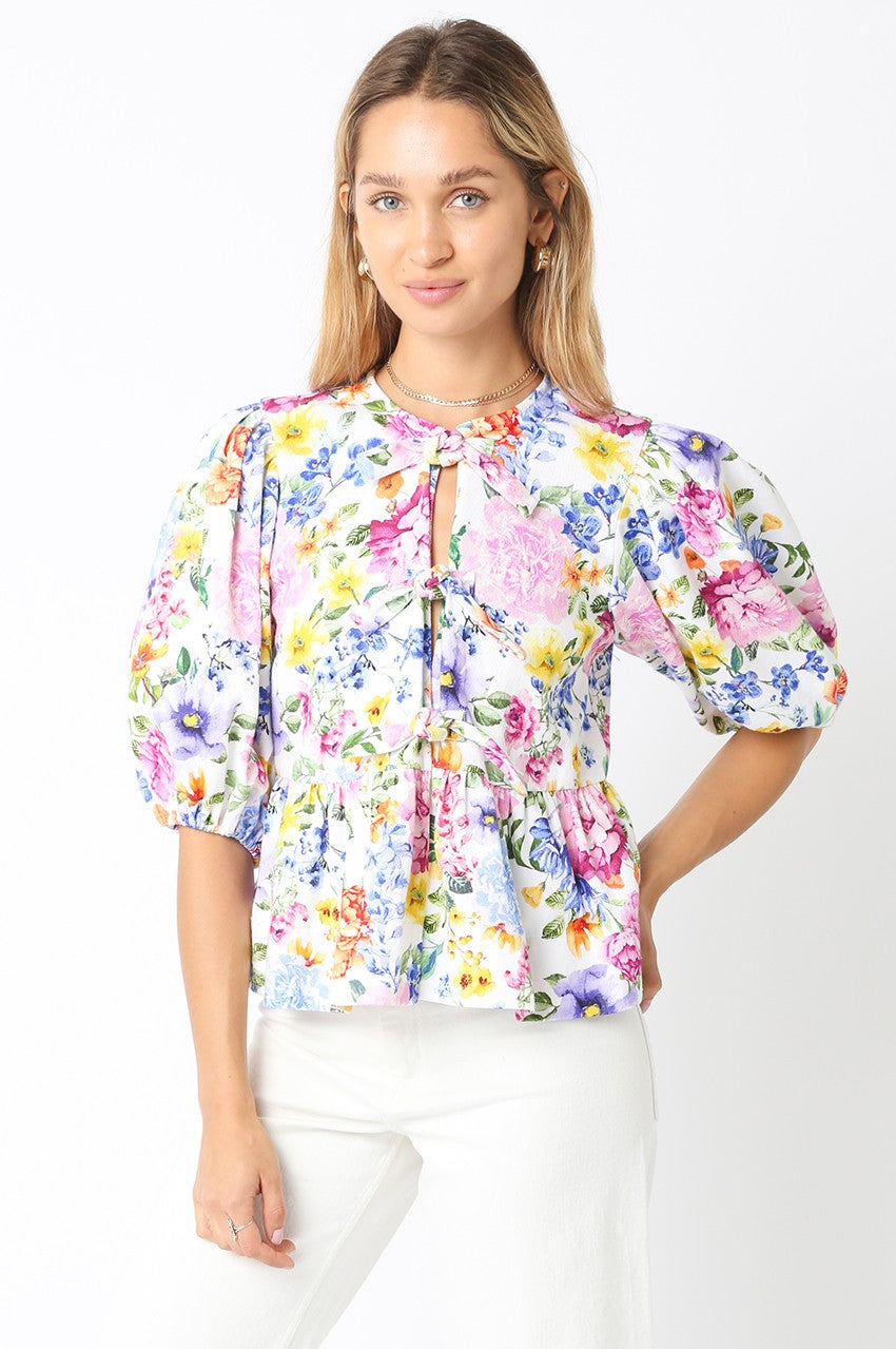 The Daisy Top features a pastel denim material floral print. The top has a tie front that is open and puff sleeves. Peplum Style Hem. Perfect little top for spring and summer!