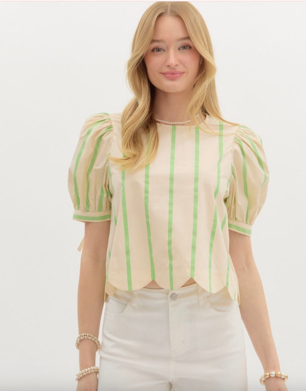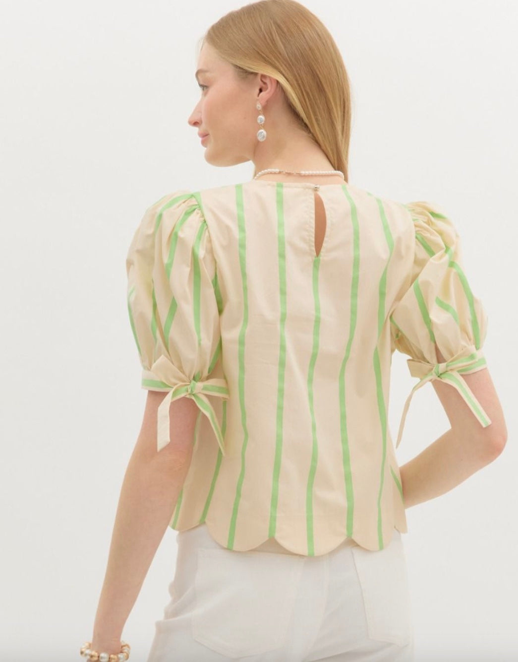 Stripe pattern bow tie cuff band short sleeve closure pullover top featuring scallop hem finish. Single button keyhole closure at back. Unlined. Woven. Non-sheer. Lightweight.