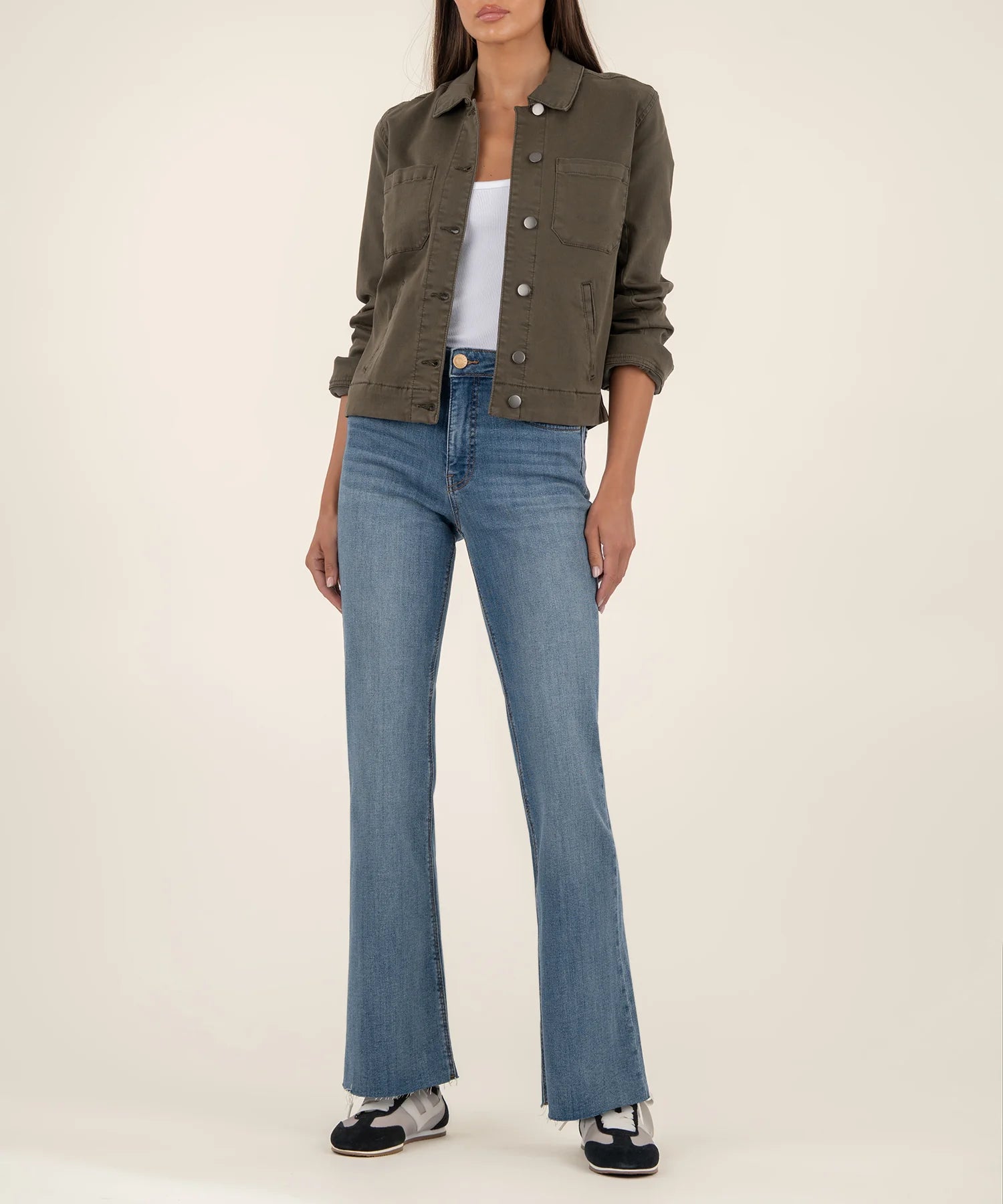 This boxy jacket features both front patch and welt pockets for a mix of utility and clean lines, finished with a classic button-front closure. A modern layer with a relaxed edge.