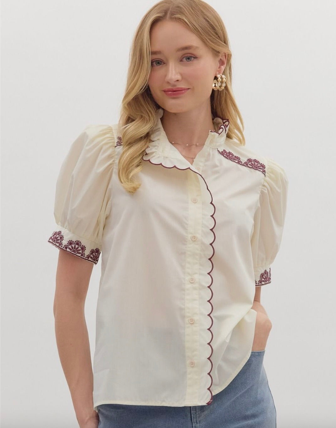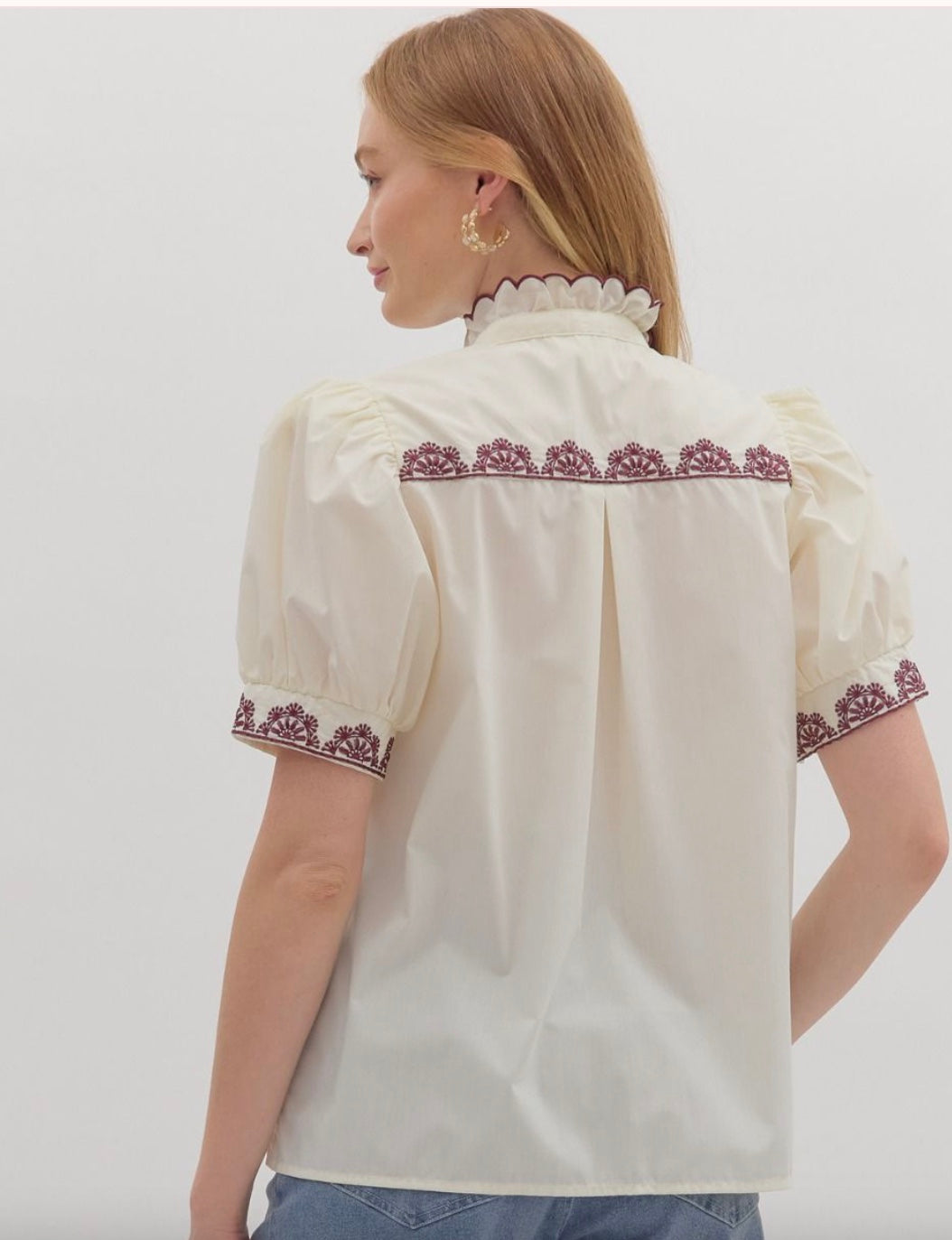 Solid embroidered short puff sleeve top featuring scallop accent trim and high ruffled neck. Embroidered back yoke detail. Button closure at front. Unlined. Woven. Non-sheer. Lightweight.