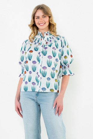 Smocked Neck Button front floral top with smocking detail at sleeve