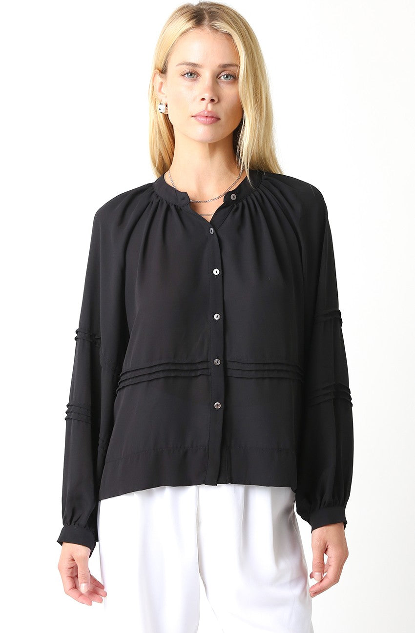 Long Sleeve Sheer Black Top, Button Front with Pintuck Detail on sleeves