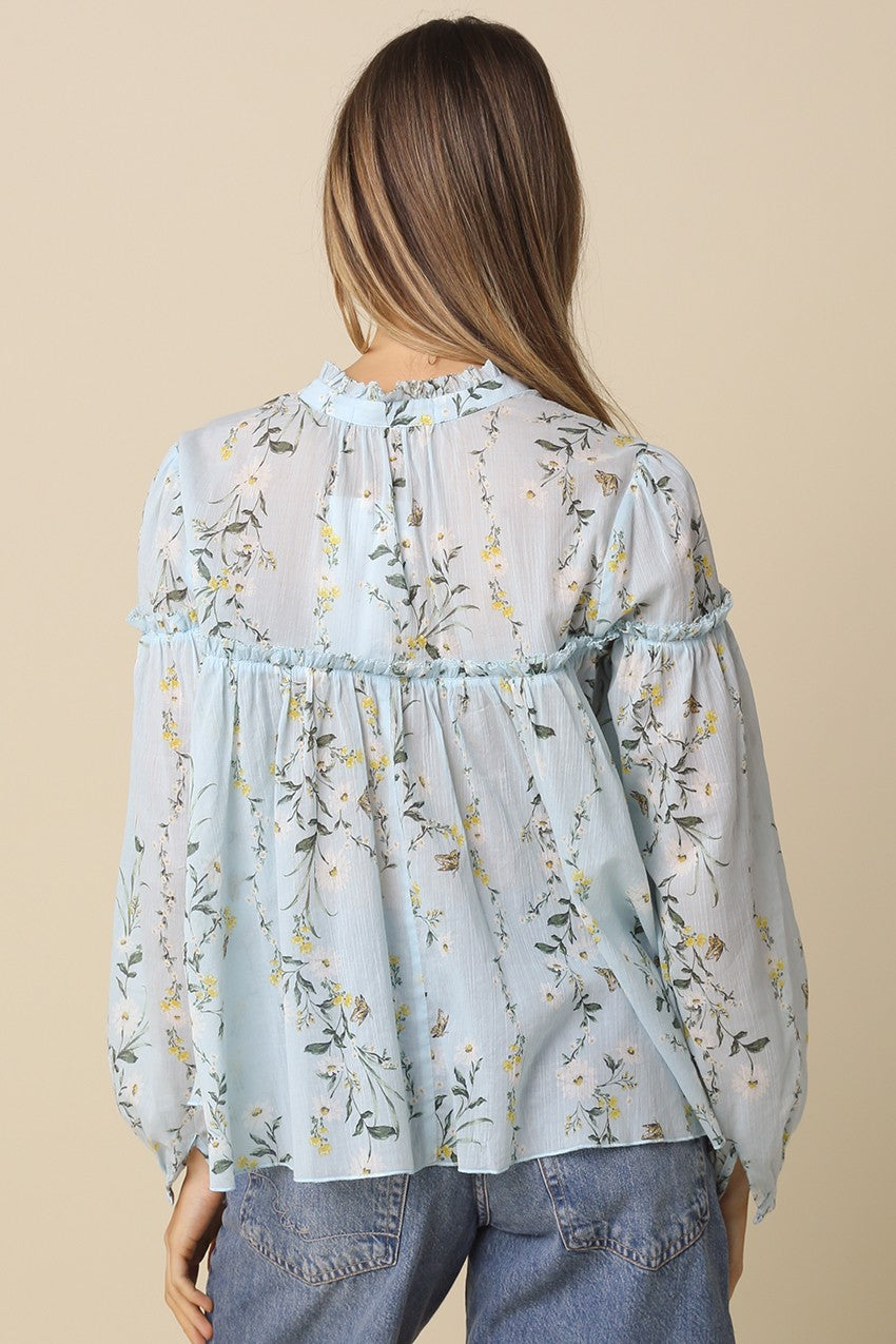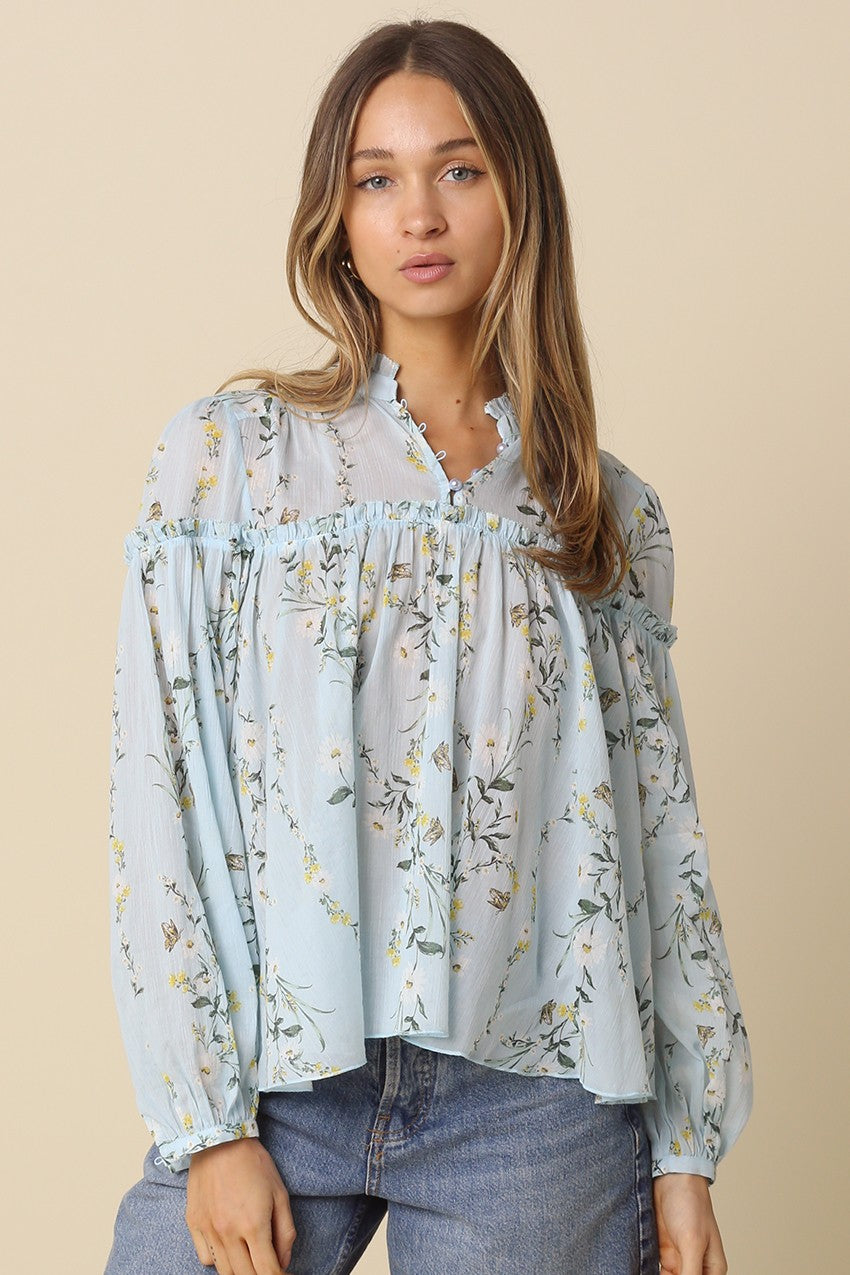 Our Salara Floral Ruffle Blouse features a sheer yoke with delicate ruffle trim for a feminine touch and voluminous balloon sleeves with gathered cuff