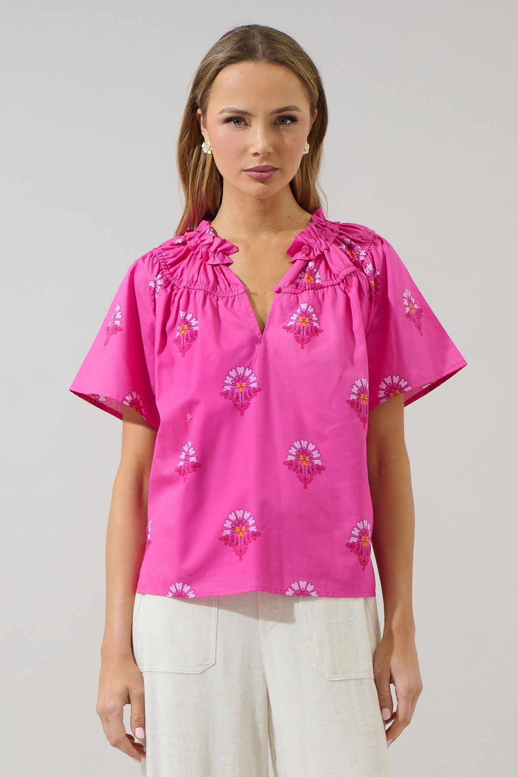 - Floral - Short sleeve - Relaxed fit - Ruffle details