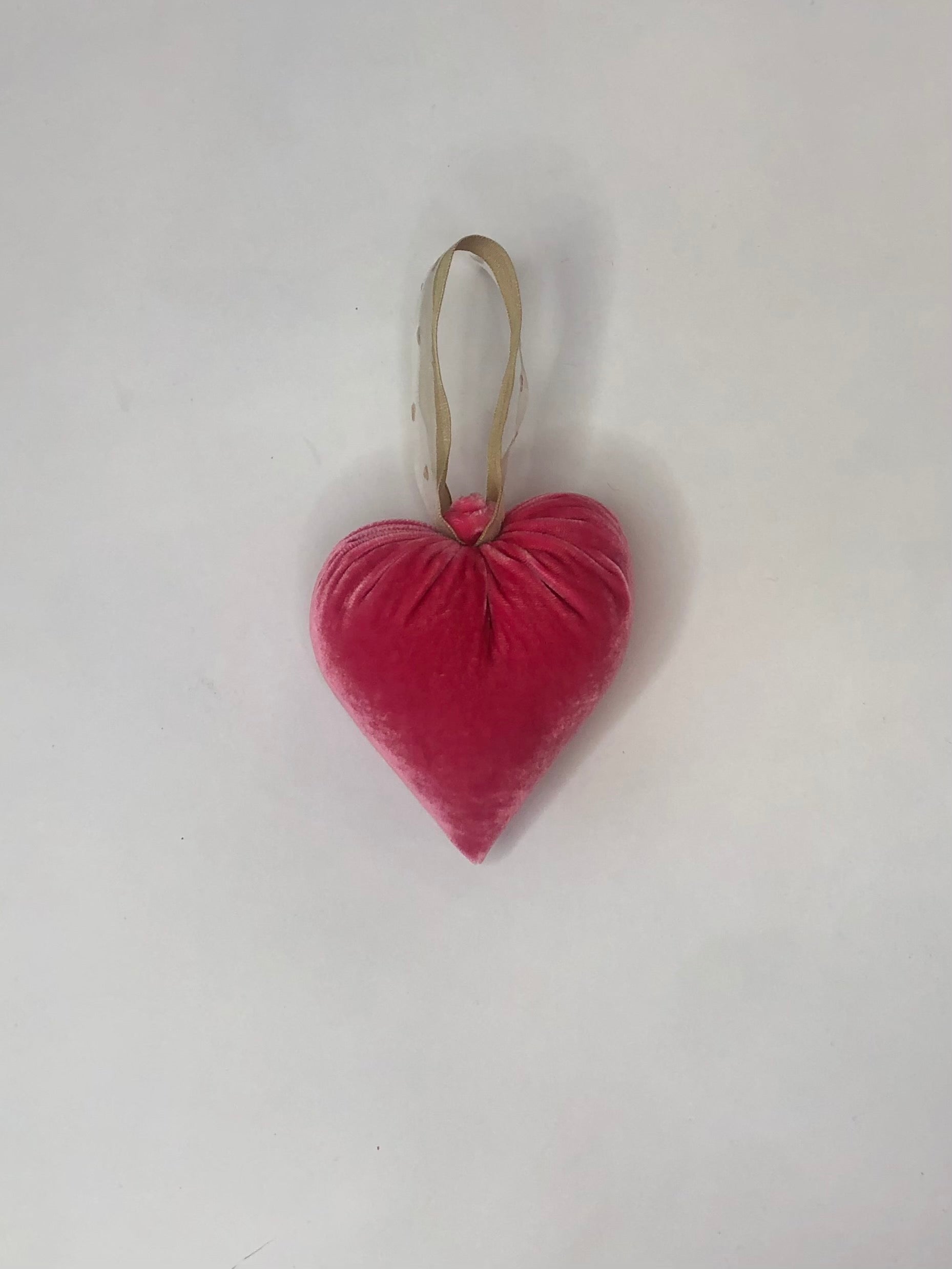 Silk velvet heart with a decorative gold ribbon loop. Each silk velvet heart is made to order by a trained Hot Skwash artisan and finished with a custom coordinated rosette.