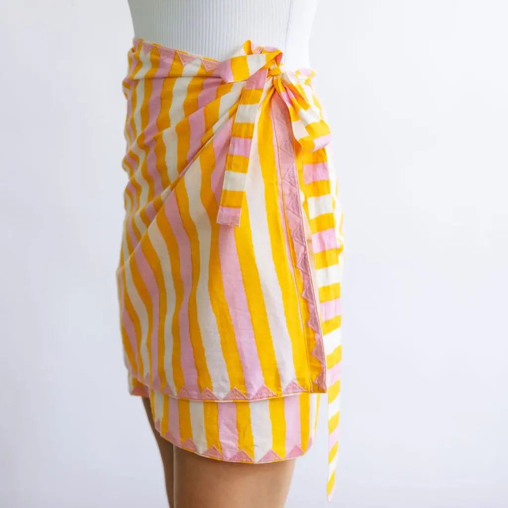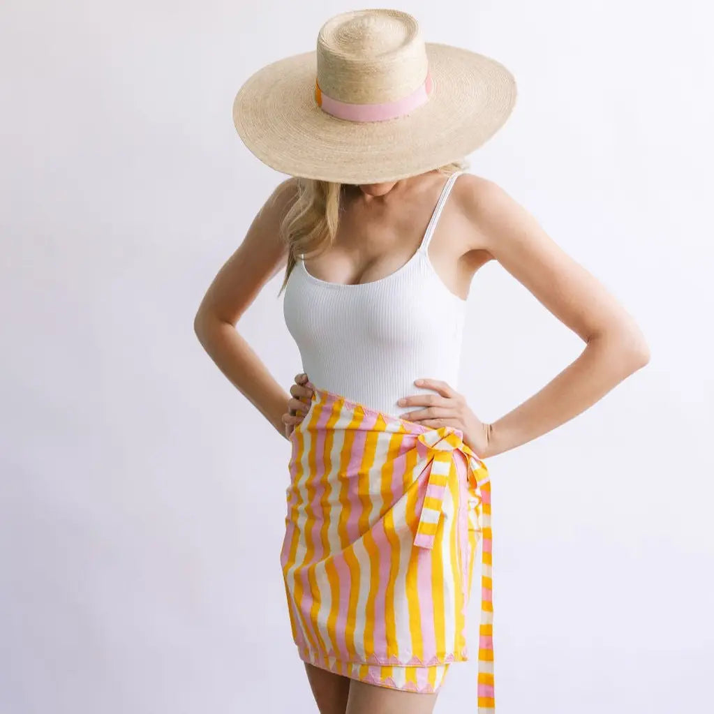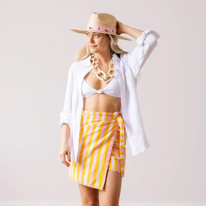 The Sunkissed Stripe Marina Mini Sarong, made from lightweight cotton, is a versatile beach cover-up that can be worn as a skirt, dress, or scarf. Stay stylish and comfortable with this easy-to-pack summer essential.