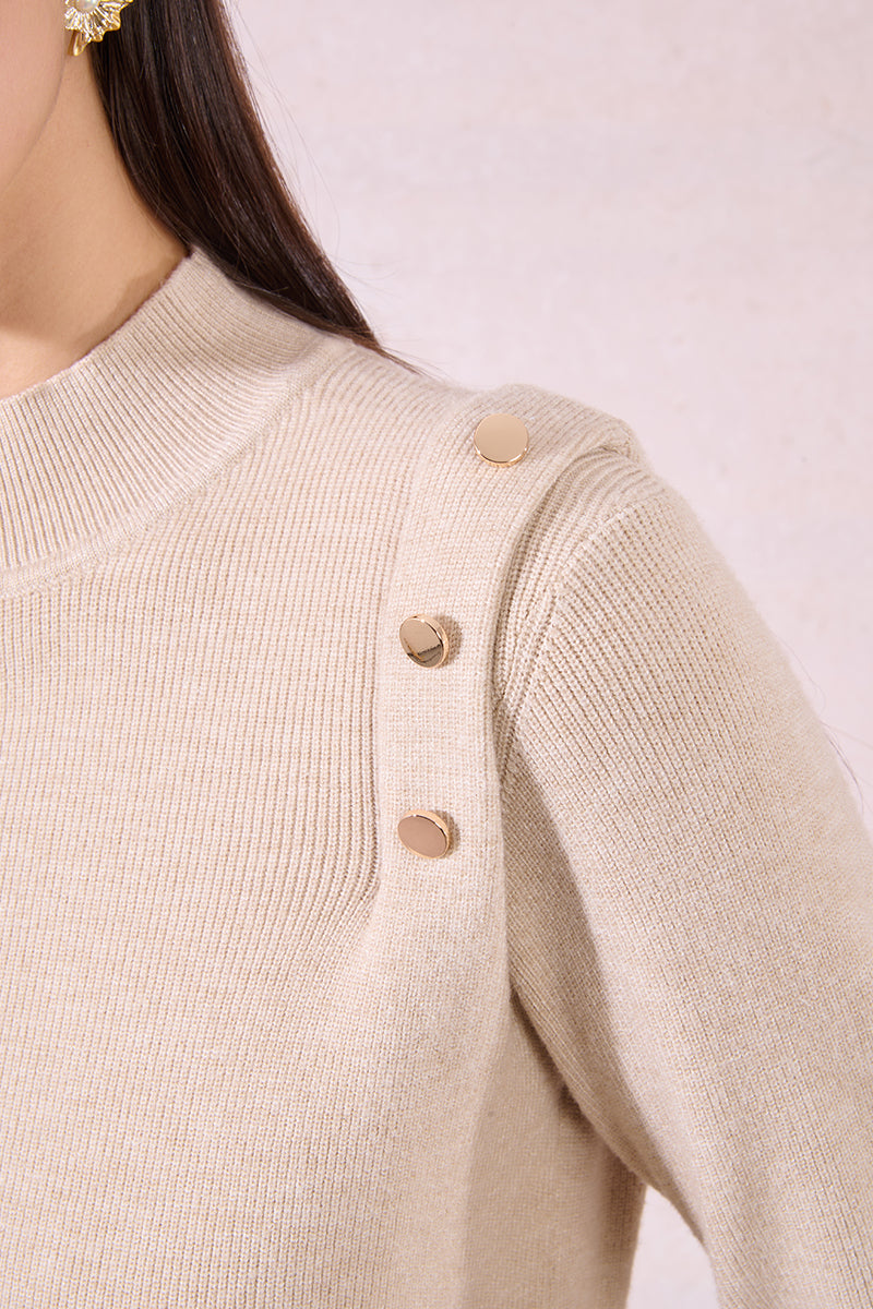 Mock Neck Beige Sweater with Gold Button Detail on the shoulder